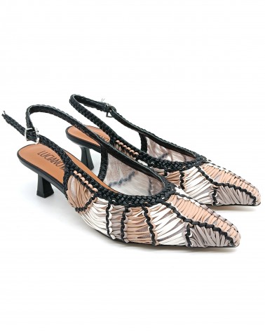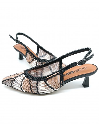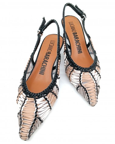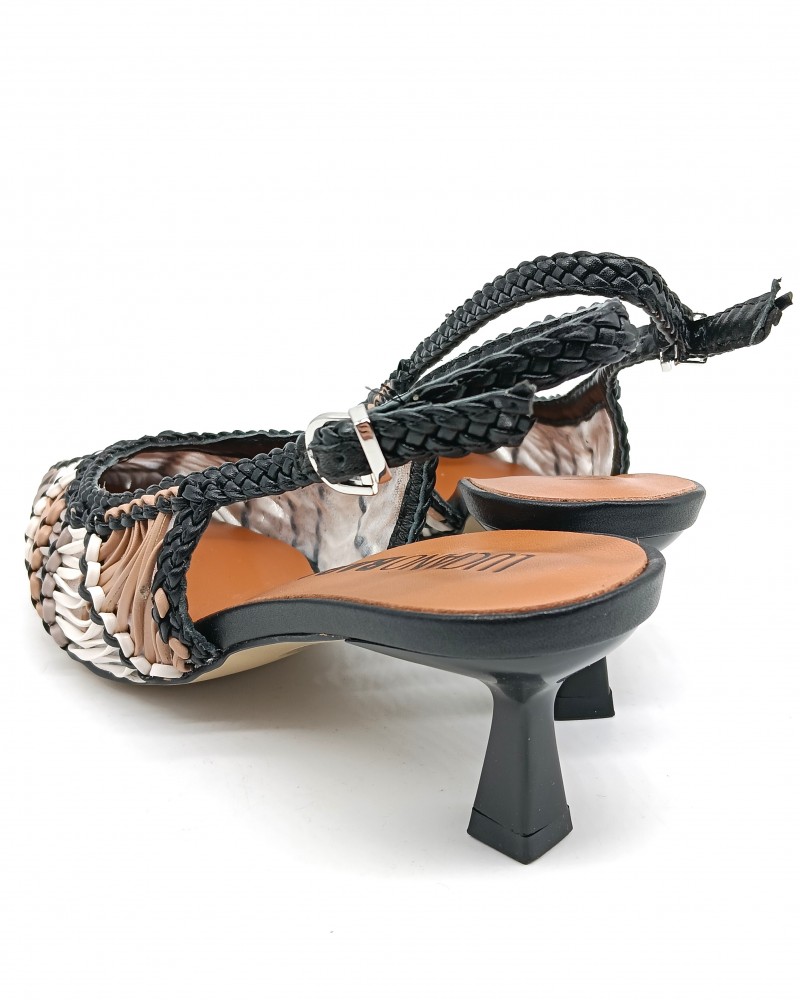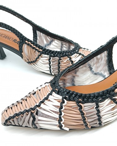 Slingback dal gusto ricercato, perfetto per chi cerca una scarpa che unisca comfort quotidiano e raffinatezza artigianale. La tomaia in pelle multicolor, sui toni del nero, bianco, fango e beige, è valorizzata da un intreccio traforato creato da listini che si annodato tra di loro che offrono leggerezza visiva e garantiscono traspirabilità. La punta sfilata dona slancio alla silhouette, mentre il tacco a rocchetto di 5cm offre stabilità senza così rinunciare all'eleganza. La suola in gomma ultra sottile presenta anche una piccola isola antiscivolo garantendovi aderenza su ogni superficie. Perfetta per le vostre occasioni speciali o per elevare look più giornalieri. Calzata regolare.