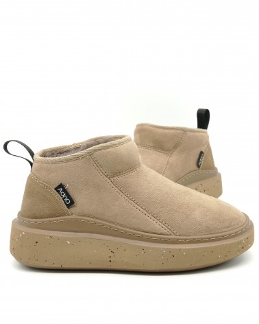 Stivaletto dal taglio basso, versatile e facile da indossare in diverse situazioni quotidiane, comfort e calore sono garantiti. Coccolatevi con il suo tocco vellutato di montone scamosciato e il morbido e caldo pelo interno. La suola è realizzata in mescola bimateriale, una generosa intersuola in EVA mescolata con materiale di scarto industriale riciclato e un battistrada in gomma molto grippante e resistente. L'altezza della suola è di circa 3,5 cm da terra, per una migliore protezione del piede.