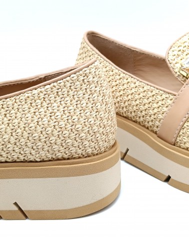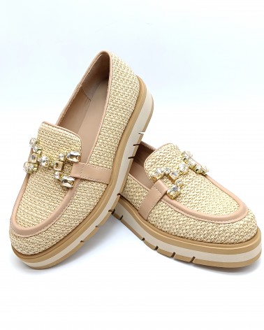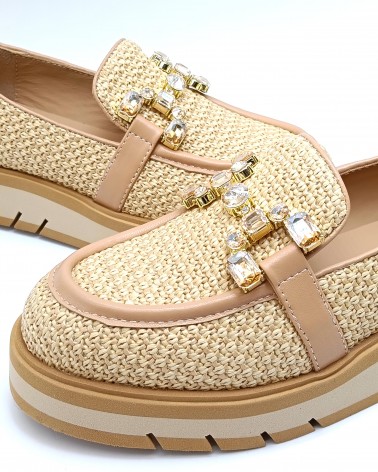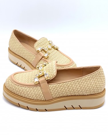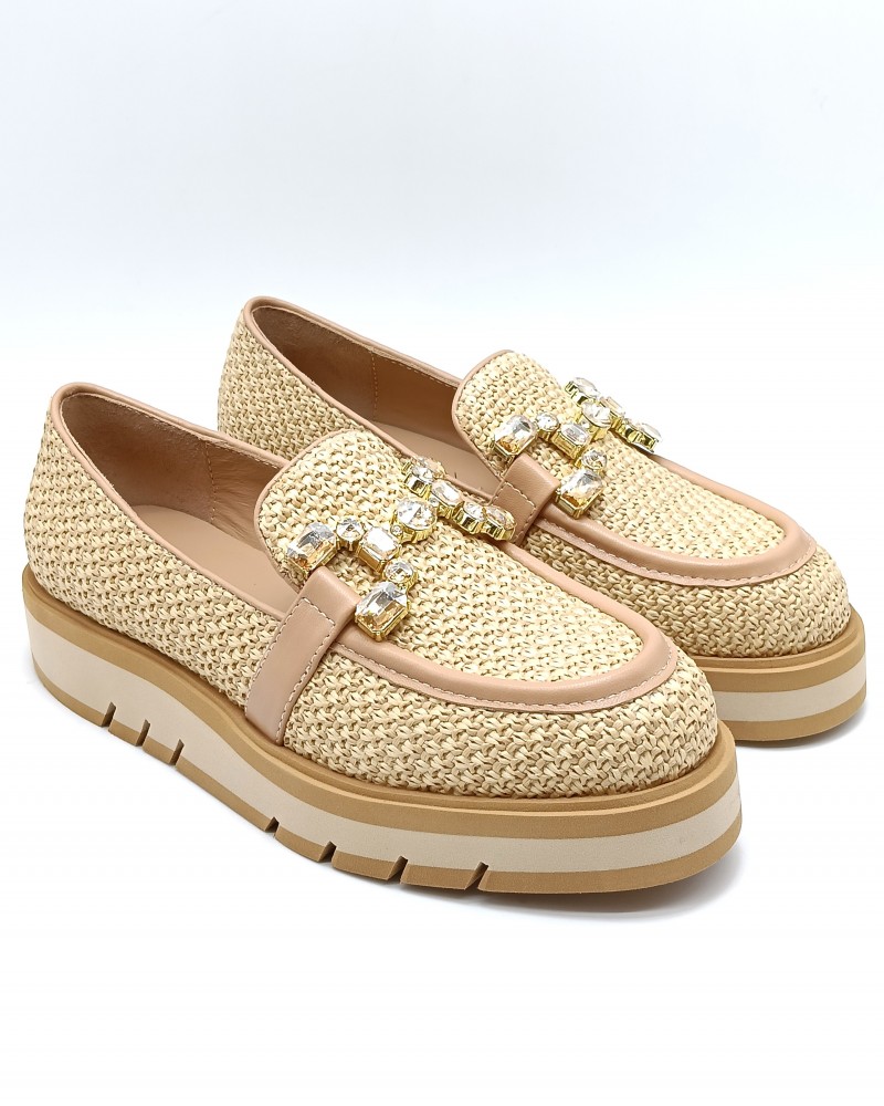 Mocassino di Bruno Premi in pelle e rafia colore naturale. Accessorio con pietre tono su tono a rifinire. Suola in gomma bicolor alta 3cm. Fodera e soletta in pelle.
