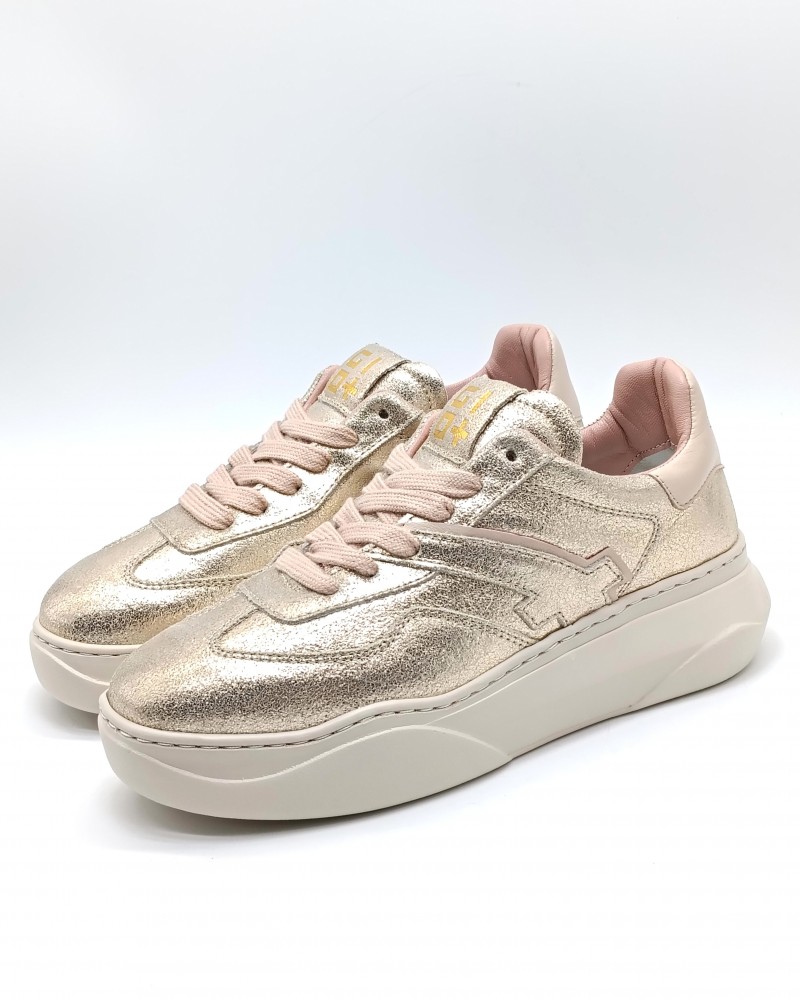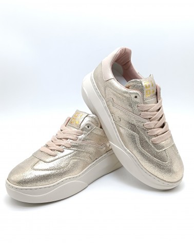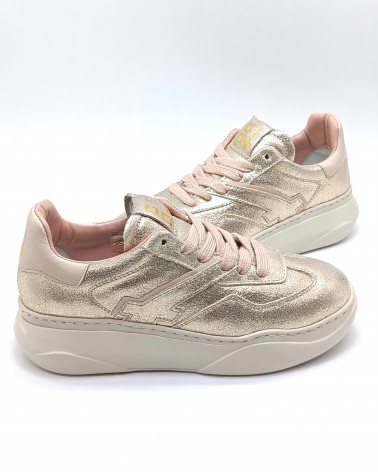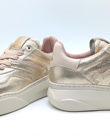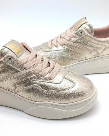 Sneaker di Gio+ in pelle laminata platino con talloncino in pelle cipria. Lacci piatti in cotone e riporti sulla tomaia in pelle. Fondo in leggerissima gomma e soletta interna estraibile.