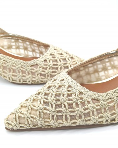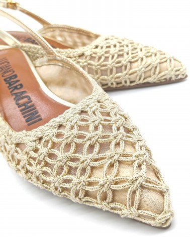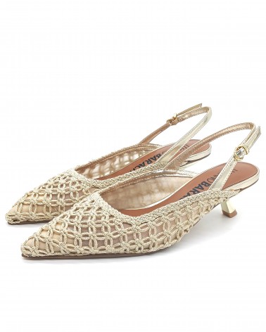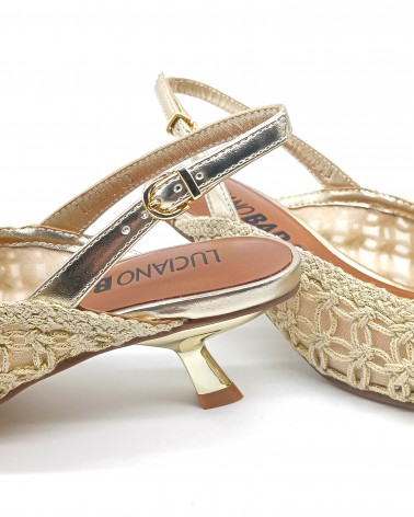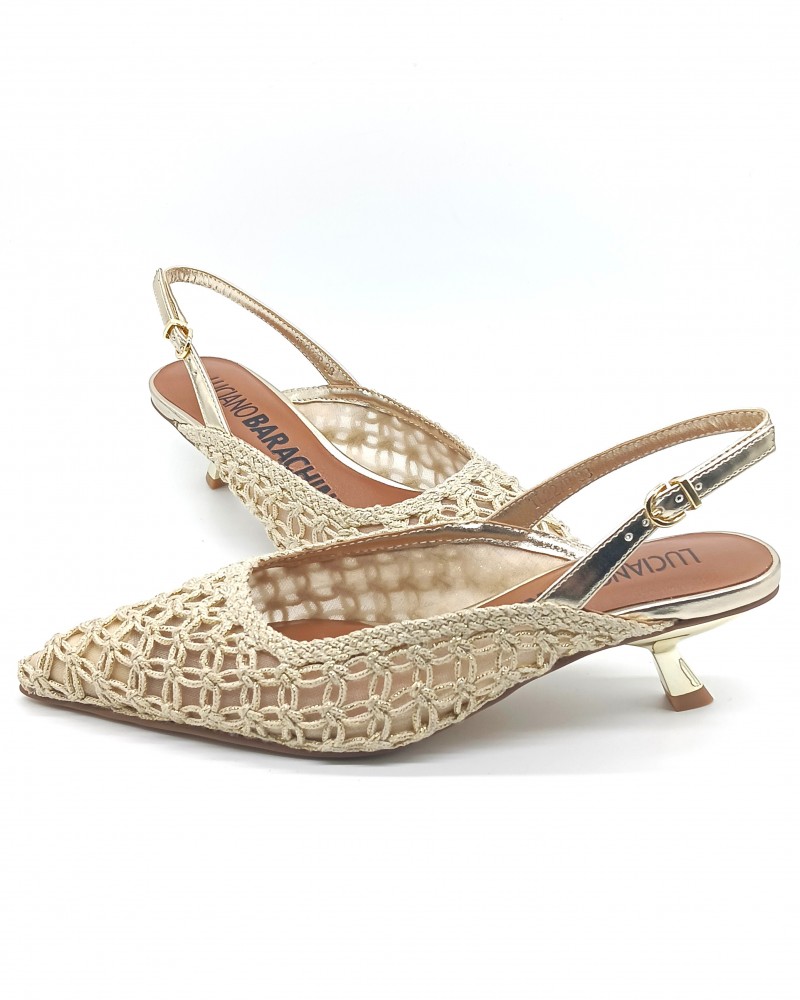 Chanel di Luciano Barachini con laccino regolabile, realizzato con una lavorazione di tessuto a rete ed intreccio. Comodo plantare imbottito in pelle e tacco a rocchetto alto 5cm che ti permette di camminare comodamente.