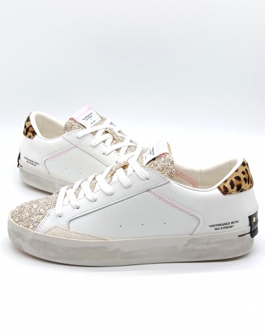 Sneaker di Crime London in pelle bianca con glitter platino e dettagli in suede panna. Talloncino in cavallino leopardato e patch in pelle nera sul retro. Linguetta in glitter oro con label logata in tessuto. Lacci in cotone e soletta interna in pelle estraibile.