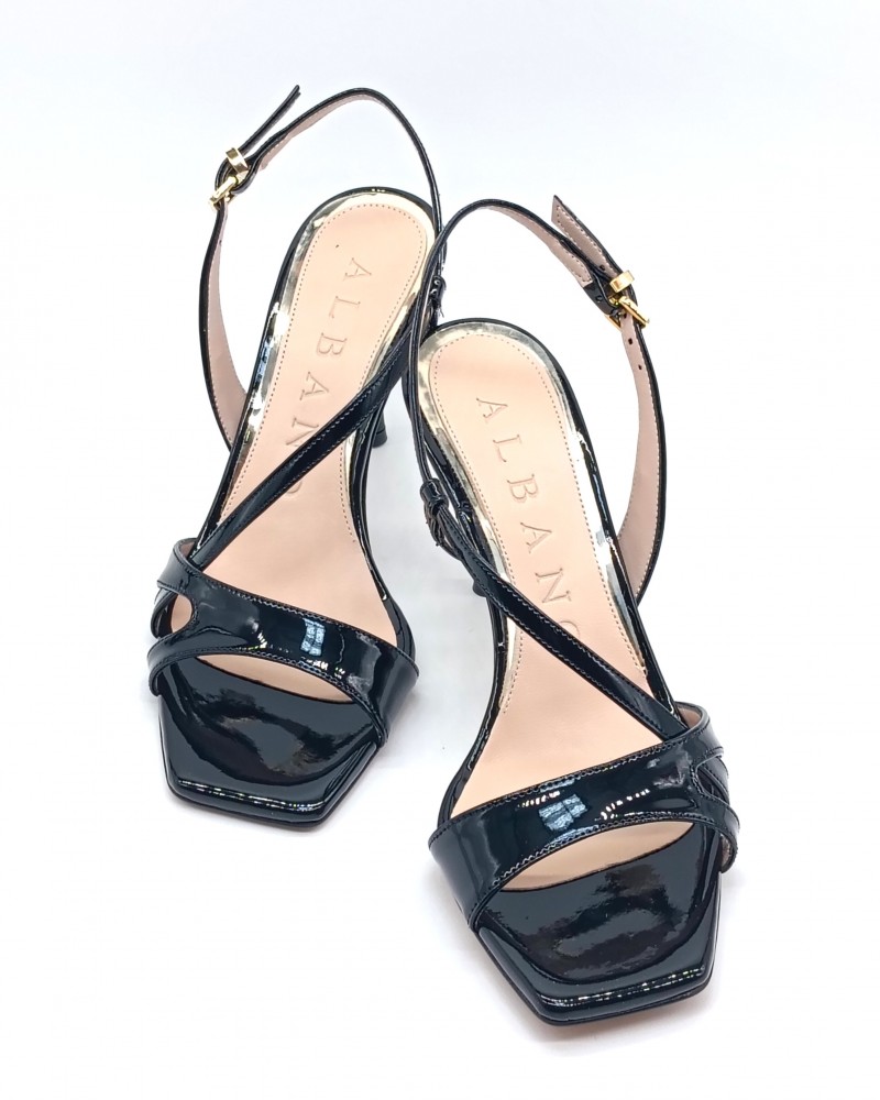 Sandalo di Albano dalla punta quadra con laccio trasversale in vernice nera. Laccino regolabile con fibbietta in metallo. Sottopiede in pelle, suola in vero cuoio e tacco alto 7cm.