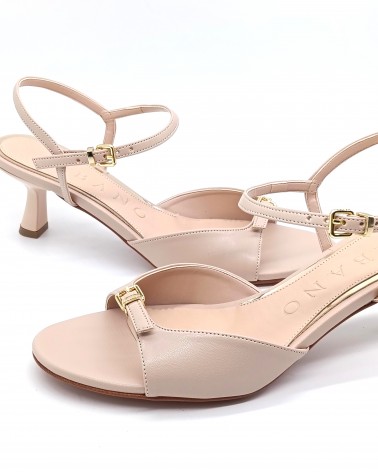 Sandalo di Albano in pelle nude con fibbietta decorativa sulle dita del piede. Cinturino alla caviglia regolabile e sottopiede in pelle. Fondo in vero cuoio e tacco alto 5cm.