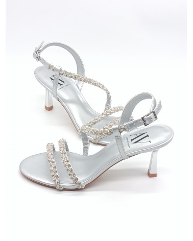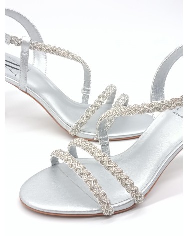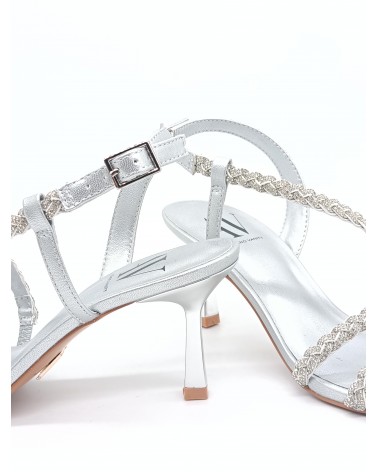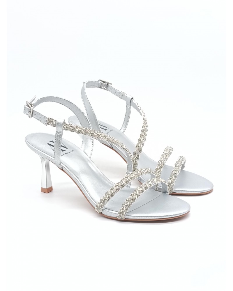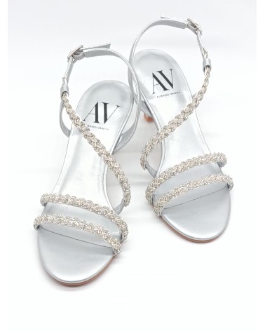 Sandalo di albano Vanity realizzato in strass ed ecopelle. Presenta fasce intrecciate sul collo con strass e cinturino regolabile laterale. Fondo gomma e tacco 5 cm.