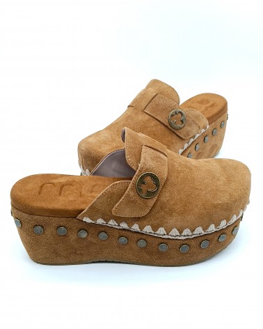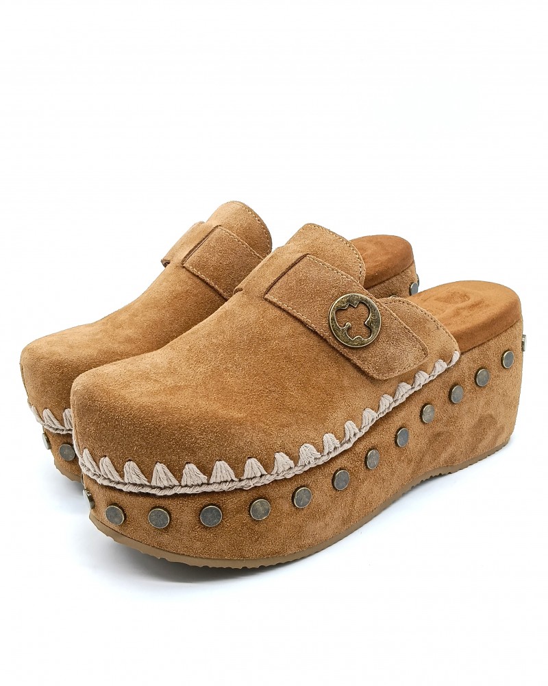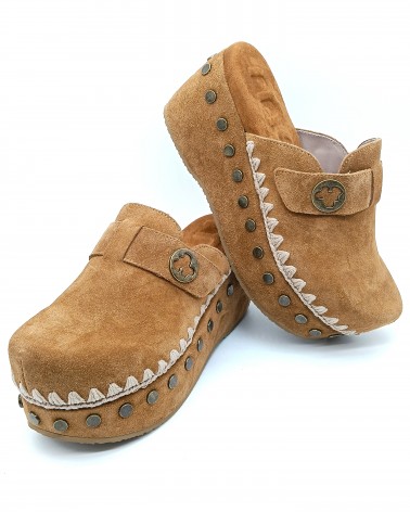 La Clog di Mou è realizzata a mano in camoscio con le cuciture all'uncinetto in cotone distintive di Mou. Suola leggera ma rinforzata da una soletta imbottita in camoscio per un maggiore confort. Borchie in metallo a rifinire. Altezza zoccolo 7cm.