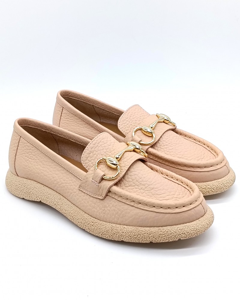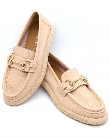 Altraofficina da vita a calzature confortevoli e ideali per essere indossate in ogni occasione. Suola ultraleggera, tomaia in pelle color cipria e morsetto sul davanti in metallo color oro.