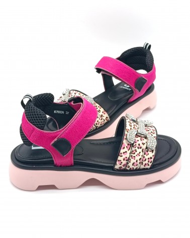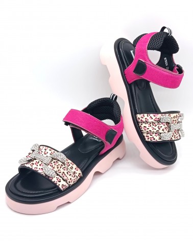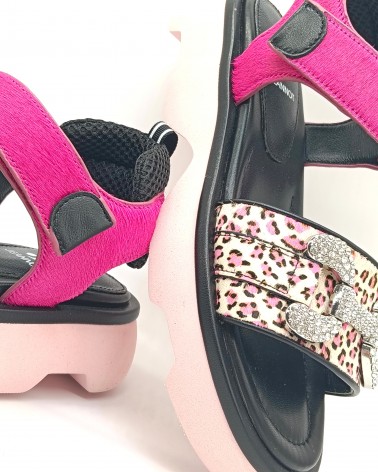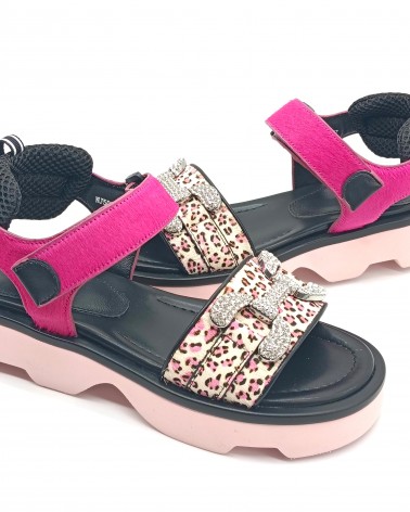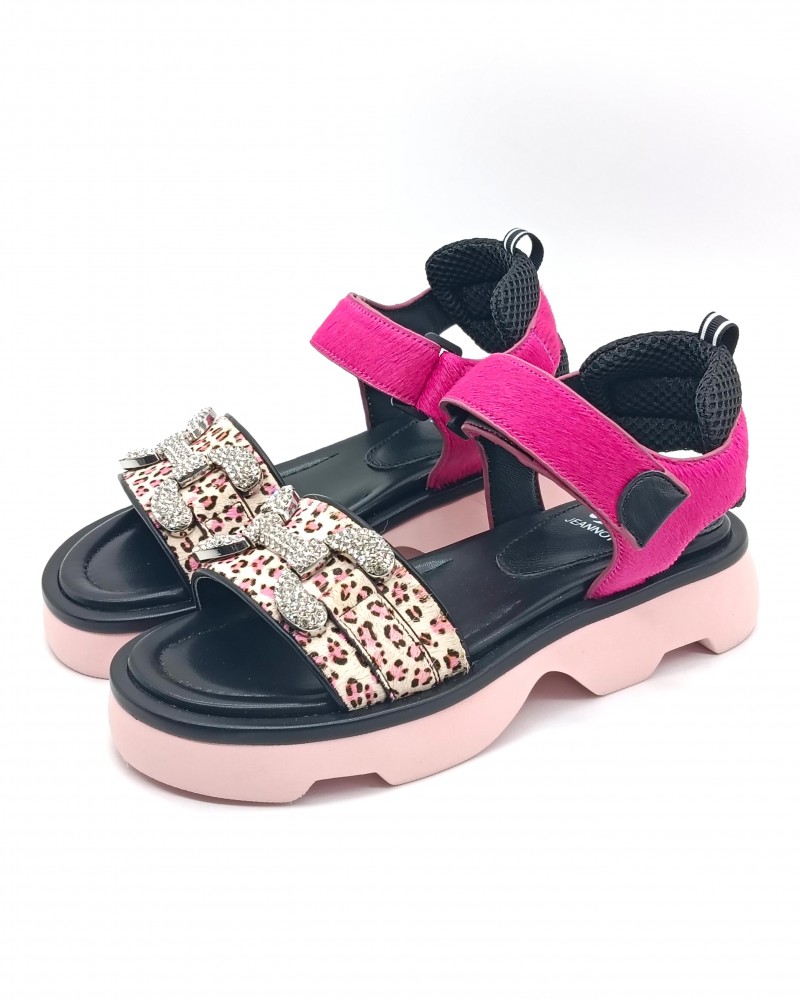 Sandali di Jeannot in pelle con inserti in cavallino e dettagli effetto animalier. Ad impreziosire applicazioni di strass sulle dita del piede. Fondo in gomma e chiusura con laccio a strappo. Eleganti e audaci, perfetti per un look glamour e trendy.