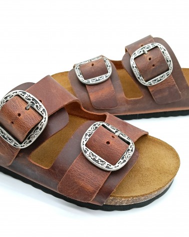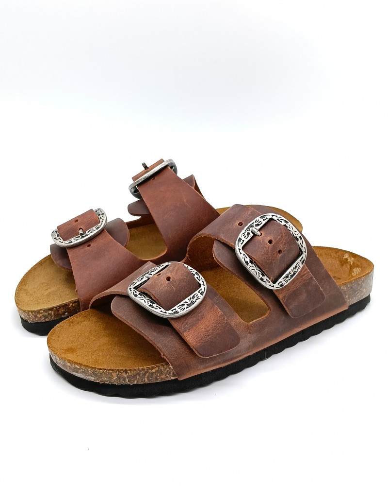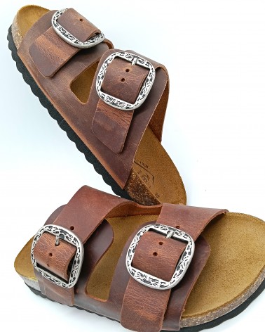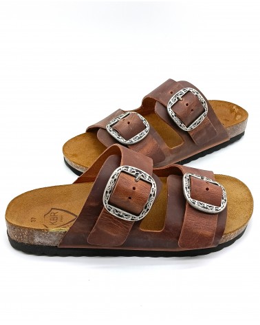 Pratica ciabatta di Kbr, tomaia con 2 fasce in pelle ingrassata cognac regolabili, rifinite con fibbie acciaio. Fondo gomma e plantare in pelle scamosciata e sughero.