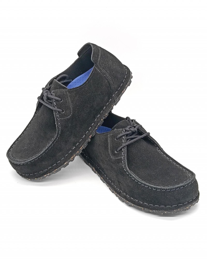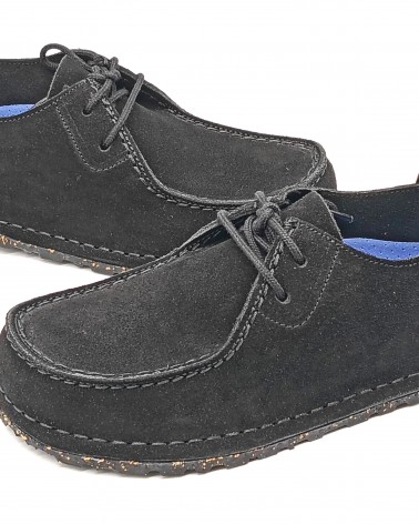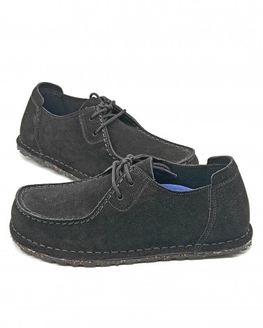 Allacciato di Birkenstock in stile mocassino con particolare cucitura. Linguetta sul tallone che facilita la calzata e dona comodità alla scarpa. Plantare originale Deep Blue Birkenstock estraibile. Tomaia in camoscio e suola in gomma di caucciù naturale con elementi in sughero.