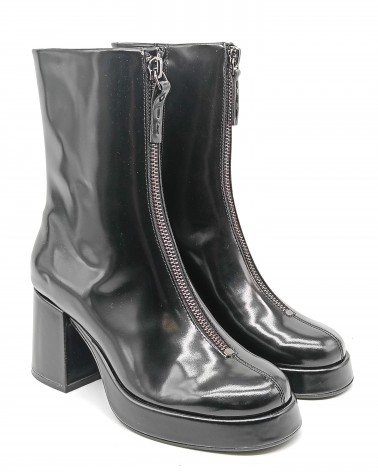 Tronchetto con tomaia in pelle nera spazzolata che dona un effetto lucido. Tacco rifasciato a blocco alto 7cm e plateau di 3cm per una maggiore stabilità e comodità. A impreziosire questo stivaletto, finta cerniera sul davanti mentre la zip nel laterale interno agevola la calzata. Gambale alto 20cm e fondo in gomma adatto per le stagioni più fredde. Modello adatto da abbinare ad abiti in maglia, gonne midi e leggins.