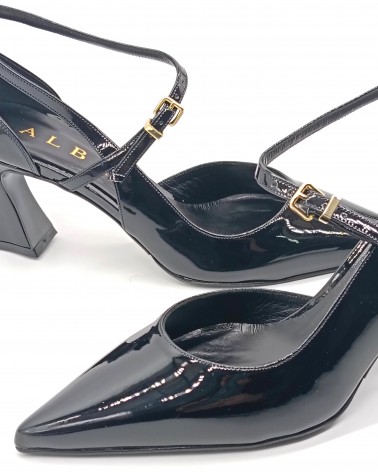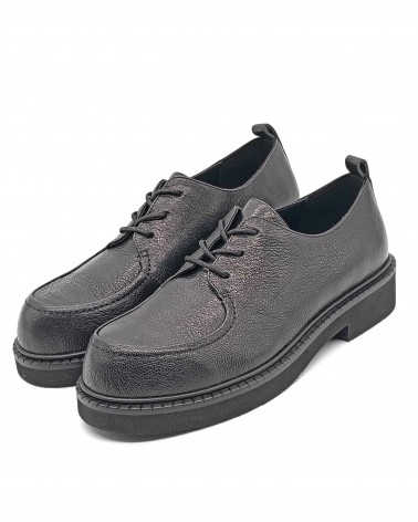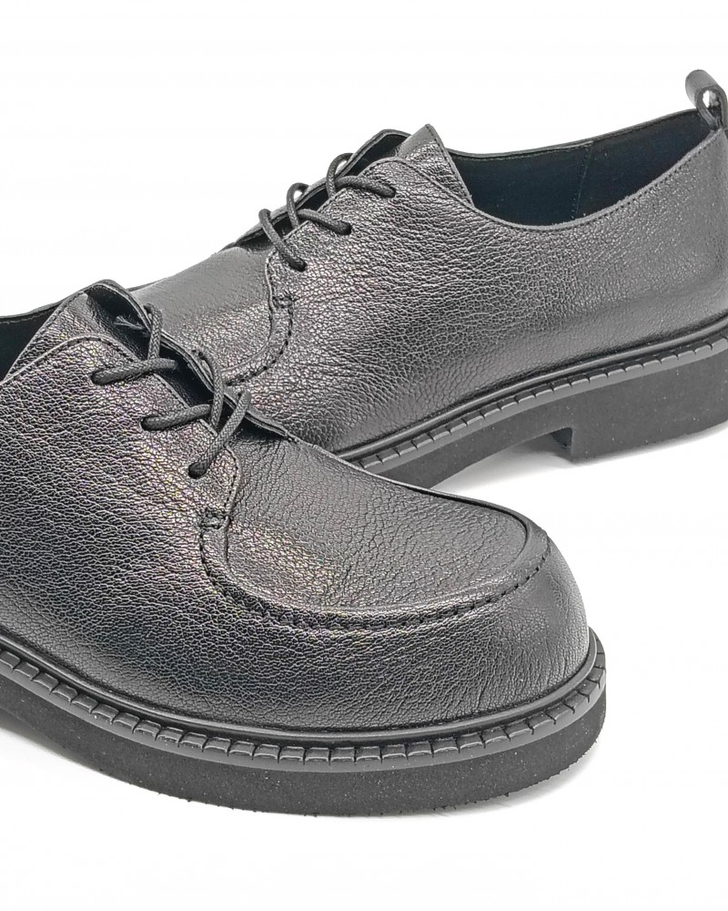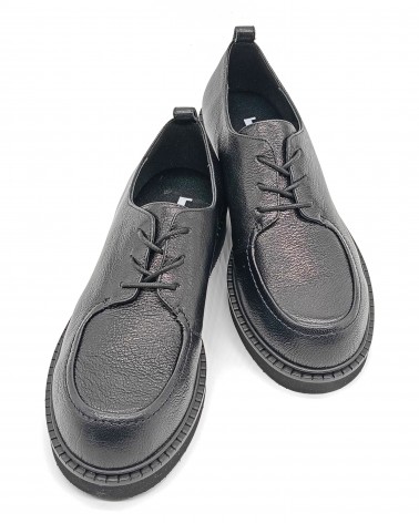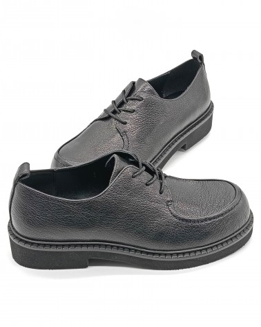 Scarpa di Jeannot con tomaia in pelle di capretto nera con vaschetta. Chiusura con lacci in cotone tono su tono e fondo in micro che dona comodità e leggerezza. Allacciato adatto per un look giornaliero.