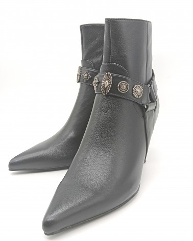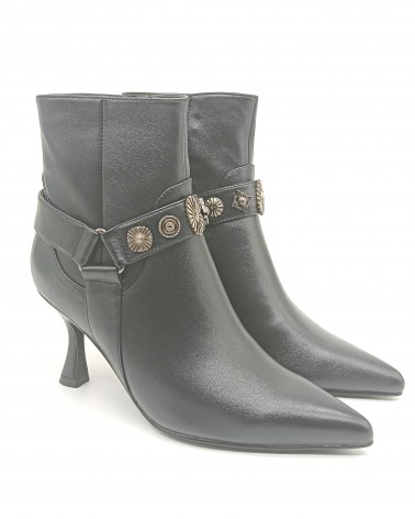 Tronchetto di Luciano Barachini che unisce praticità ed eleganza, realizzato in morbida pelle nera. Presenta una punta sfilata che slancia la silhouette e un tacco a rocchetto rifasciato alto 7cm che dona stabilità. Design liscio con cerniera laterale che agevola la calzata e la suola in gomma garantisce confort quotidiano. Ad impreziosire questo tronchetto cavigliera con accessori in metallo. Perfetto con pantaloni slim e cappotti lunghi per look urbani oppure con abiti midi per outfit eleganti.