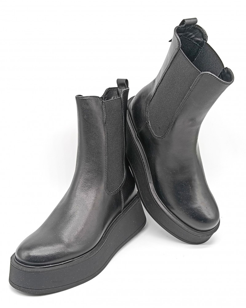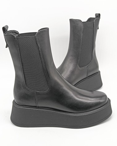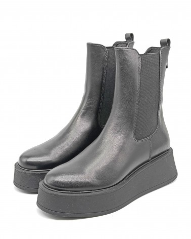 Tronchetto stile beatles con tomaia in pelle nera, classici elastici laterali tono su tono e tirantino posteriore che agevola la calzata. A rendere casual ma allo stesso momento elegante questo stivaletto, è la suola platform alta 5cm che dona un tocco di slancio alla figura senza rinunciare al confort e alla stabilità. Tronchetto dal design raffinato, perfetto per ogni occasione.
