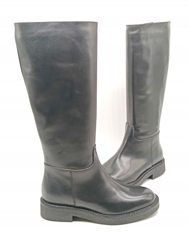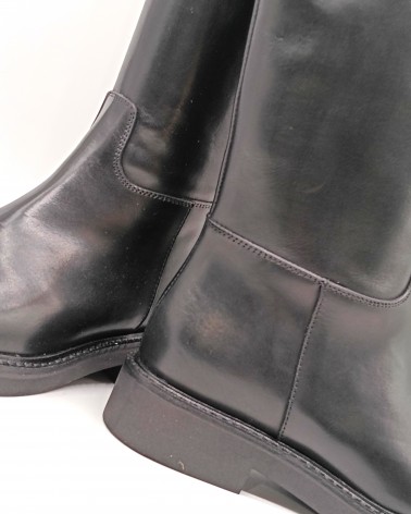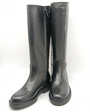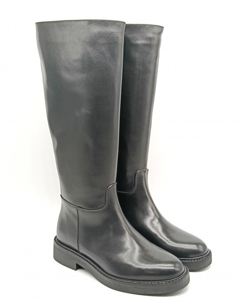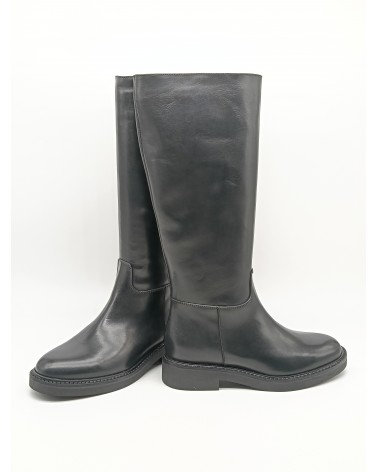 Stivale alto modello cavaliere realizzato in pelle nera. La sua linea elegante e pulita lo rende perfetto per look raffinati, con abiti midi e cappotti lunghi ma anche super glamour per look urbani e giornalieri, con pantaloni slim infilati nello stivale. Il gambale avvolge la gamba con naturalezza grazie alla pratica cerniera laterale e ad un piccolo soffietto ad elastico presente all'estremità. La suola in gomma garantisce resistenza e comodità anche nelle giornate più fredde. La progettazione e lavorazione di questo prodotto avviene interamente in Italia, utilizzando tecniche artigianali tradizionali e materiali di prima scelta.