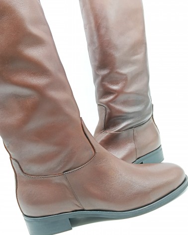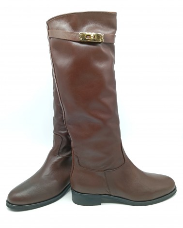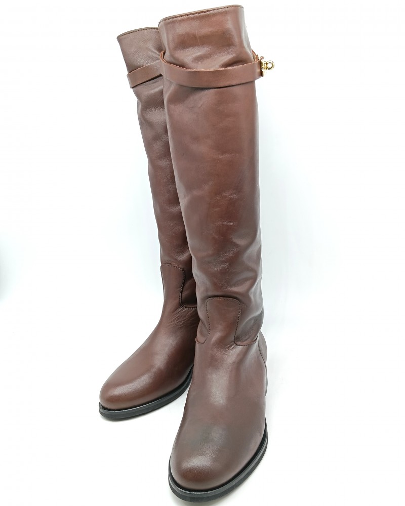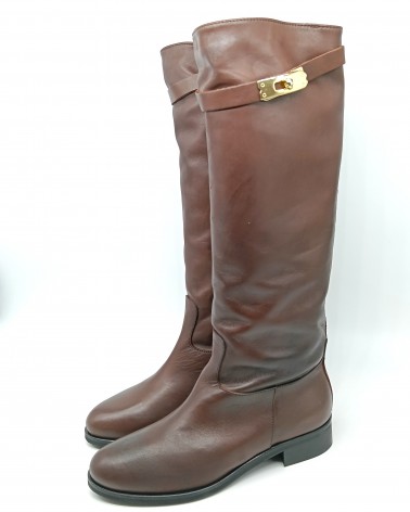 Questo stivale in pelle cioccolato di Ranyé presenta una punta tonda e un tacco di 3cm. Il gambale a tubo, privo di cerniere, offre una linea pulita e slanciata, mentre il cinturino, removibile, collocato nella parte superiore presenta una chiusura a lucchetto metallico dorato che ricorda proprio l'iconico fermaglio distintivo della borsa Kelly di Hermès, aggiunge un tocco sofisticato e distintivo alla calzatura. Se i dettagli fanno la differenza, lo stile classico e deciso lo rende un modello versatile e pratico perfetto per accompagnare look quotidiani con jeans o pantaloni aderenti che look più raffinati con abiti e cappotti over. Lavorazione artigianale 100% Made in Italy.