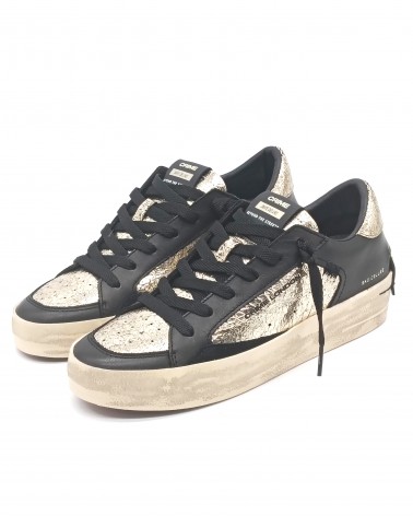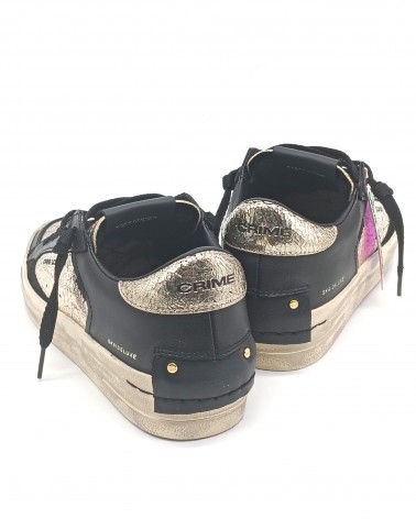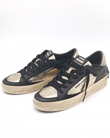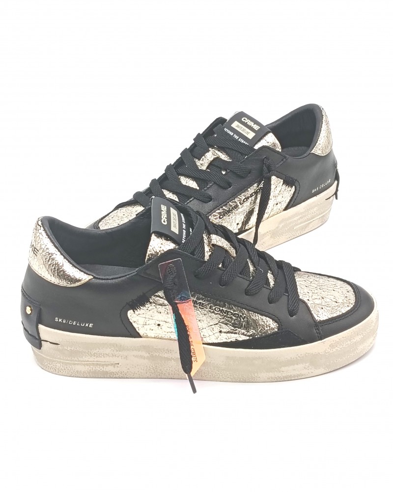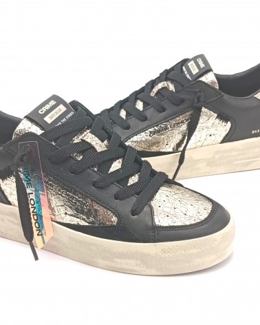 Sneaker di Crime London realizzata con materiali di alta qualità Made in Italy. La tomaia alterna parti in cracklè laminato platino e pelle nera con piccoli inserti in camoscio nero. Sul retro presenta talloncino in cracklè platino con logo stampato nero e la classica patch in pelle nera, segno distintivo del brand. La fodera interna presenta parti in pelle e spugna, mentre la soletta estraibile è in pelle. Il fondo risulta più alto sul tallone e si presenta in color miele con delle lievi sfumature che creano un effetto vintage.