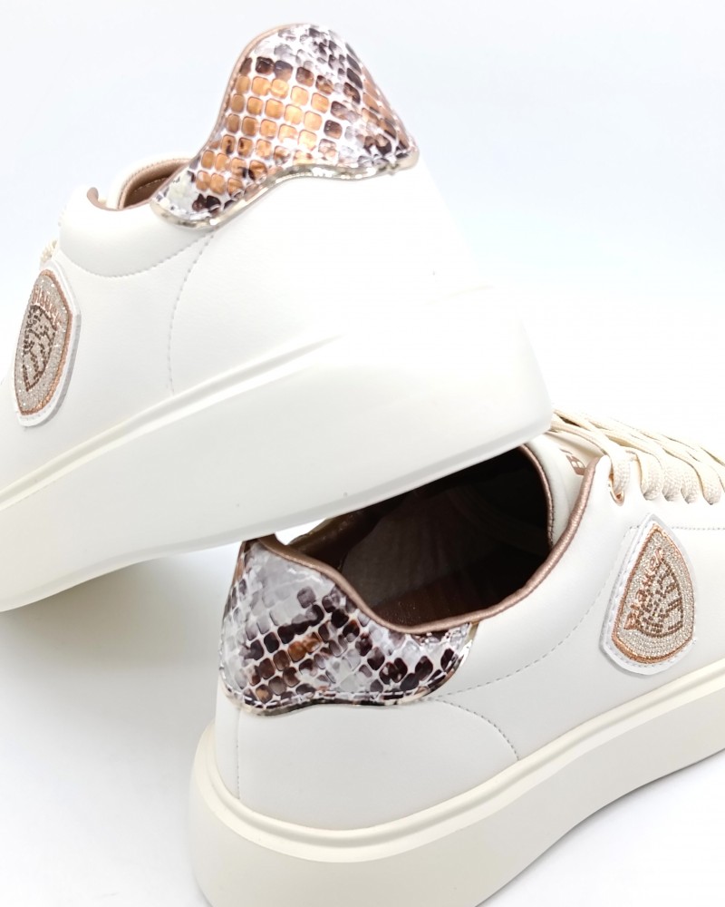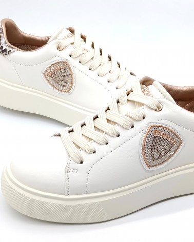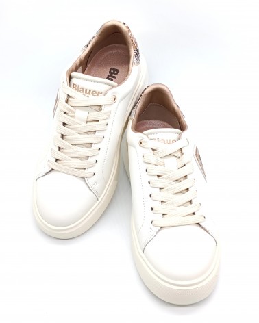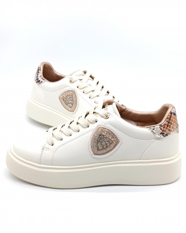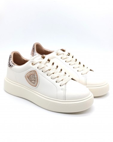 Sneaker di Blauer che rappresenta un passepartout elegante e confortevole facile da abbinare. Chiusura con lacci in cotone tono su tono e talloncino in stampato pitone. Marchio glitter nel laterale esterno. Soletta interna in pelle estraibile e suola in phylon e gomma, leggerissima e resistente.