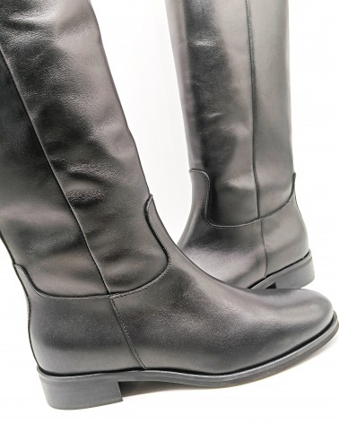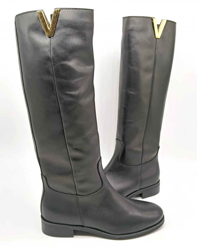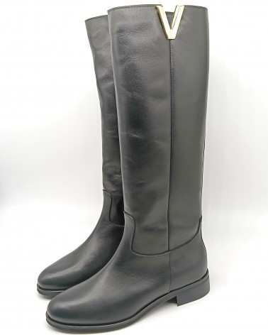 Realizzato in pelle nera, questo stivale a tubo con punta tonda di Ranyé presenta una linea verticale, alta poco sotto al ginocchio, che slancia la silhouette con delicata eleganza. Il design rimane estremamente pulito ed essenziale, impreziosito soltanto da un piccolo dettaglio dorato nell'estremità esterna del gambale che ricorda una "V". Un modello minimal che diventerà fondamentale nel vostro guardaroba, perfetto da indossare con pantaloni slim, gonne midi a ruota e abiti mini in maglia. Il tacco basso da 3cm assicura comfort quotidiano. Prodotto artigianale 100% Made in Italy.