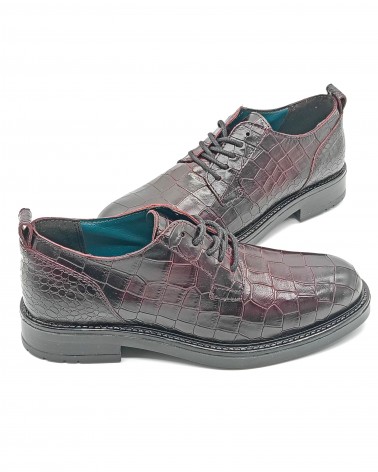 Scarpa allacciata in pelle stampata cocco color bordò. Perfette da indossare con tailleur o gonne midi, si adatta con disinvoltura a qualsiasi occasione, un accessorio versatile che non passa inosservato.