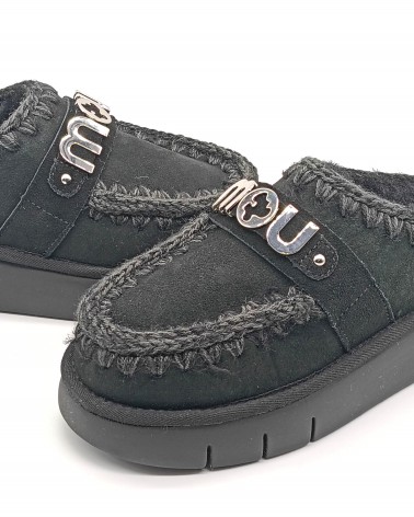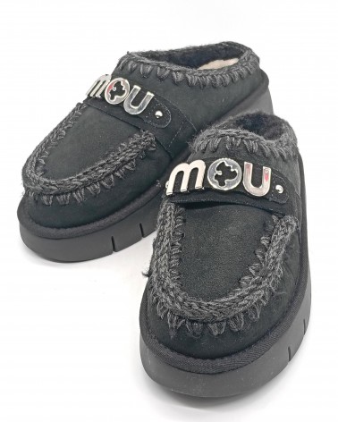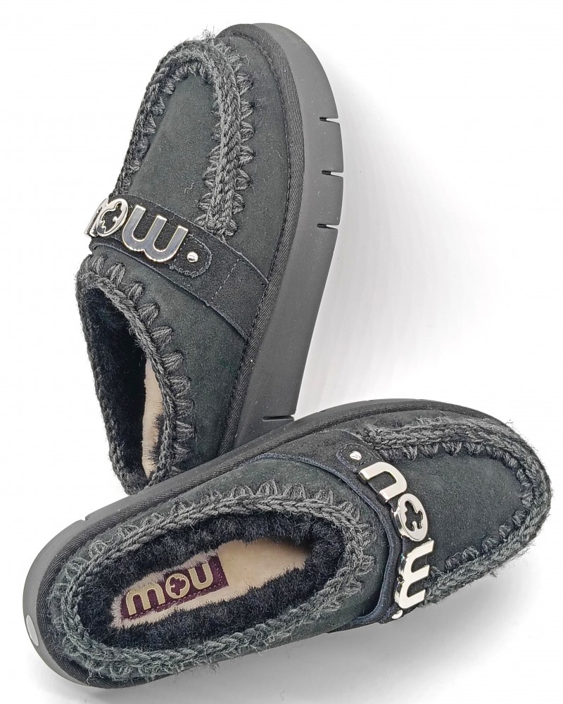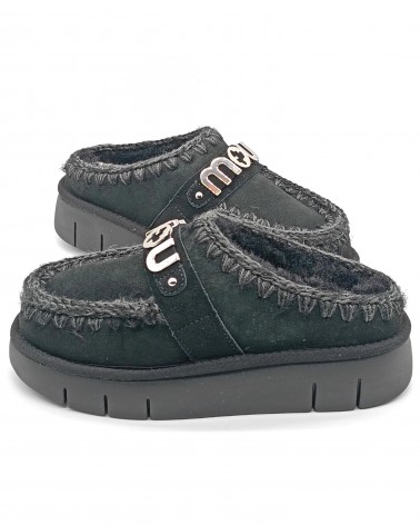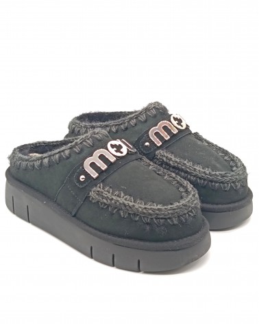 Ciabatta realizzata in vera pelle di montone e dettagli in lana all'uncinetto con logo in metallo. Plantare in morbido montone e suola leggera in EVA e gomma che rendono questo modello molto comodo da indossare.