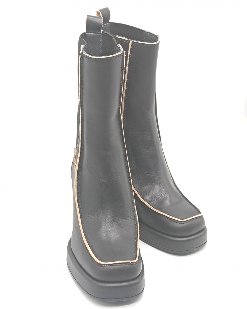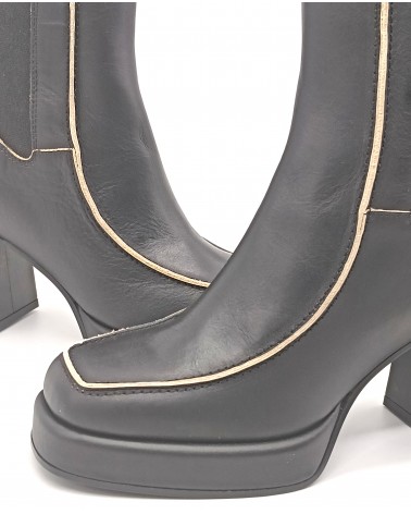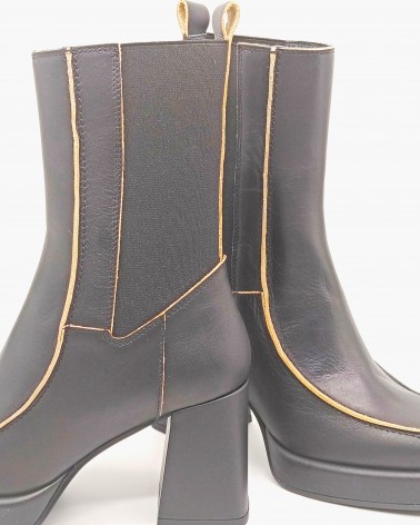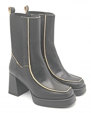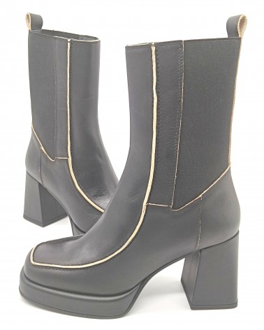 Tronchetto con elastici laterali tono su tono di Janet&Janet. Dalla punta squadrata con tacco a blocco alto 7cm e leggero plateau che donano confort e stabilità. Tomaia in pelle nera con rifiniture beige e linguetta sul tallone per indossarlo e toglierlo facilmente.