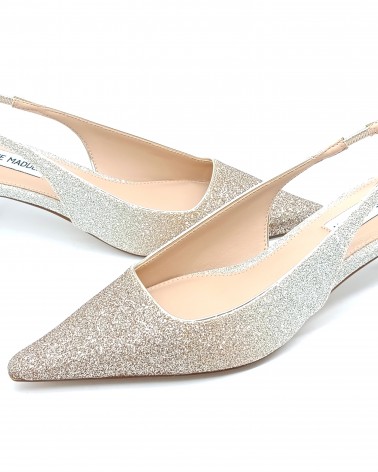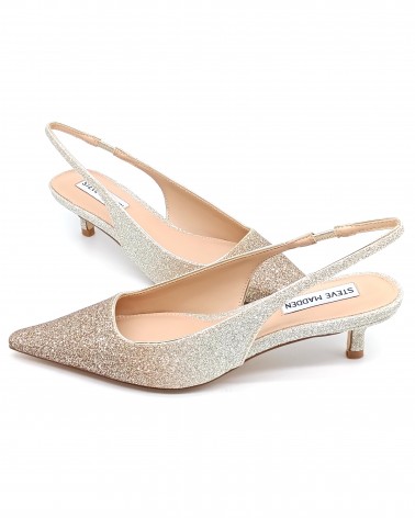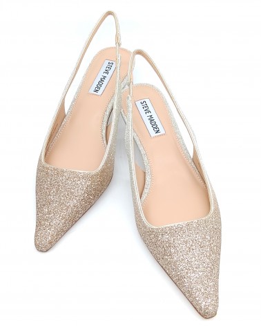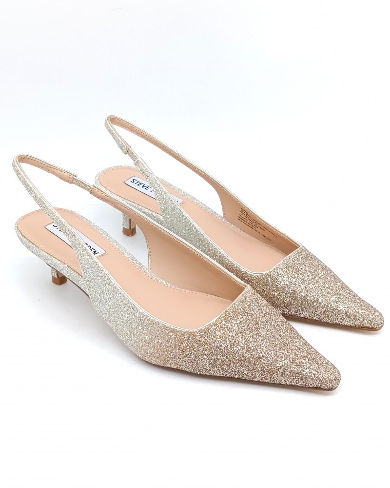 La décolleté slingback, modello slip-on con elastico, KARI di Steve Madden presenta una punta affusolata e un tacco basso, leggermente a rocchetto, che gli conferiscono una silhouette elegante e raffinata dal carattere sofisticato e glamour. La tomaia realizzata in glitter, con un particolare effetto sfumato che va dall'oro al bronzo, e il tacco da 5cm la rendeno perfetta per chi cerca la comodità nella quotidianità ma anche nelle occasioni più speciali o serate elagnti. Ideale da abbinare sia su gonne o abiti midi, tailleur sartoriali e pantaloni palazzo per completare i vostri look più chic, che su jeans ballon o wide leg per i vostri look più comfy.