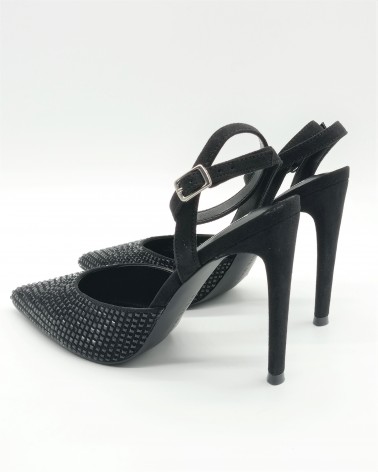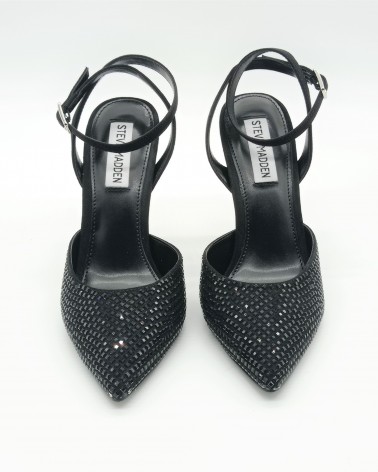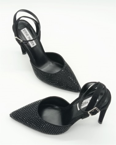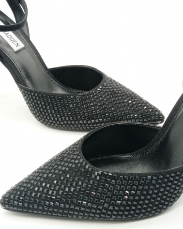 Steve Madden chanel in ecopelle nero, impreziosito di strass e cinturino incrociato girocaviglia. Tacco alto 10.5cm in camoscio nero.