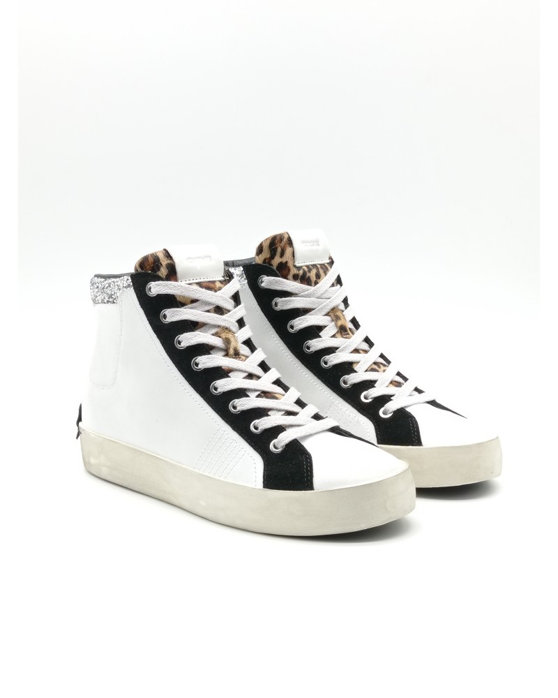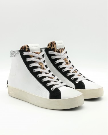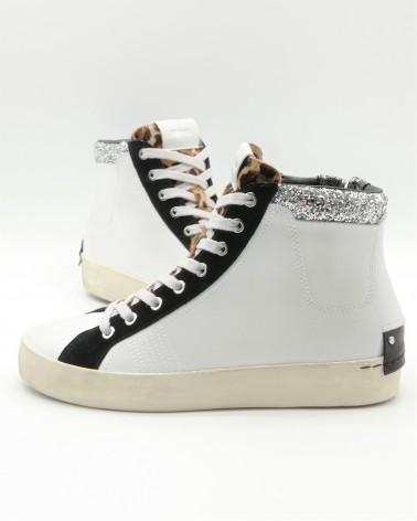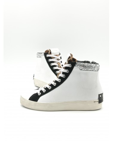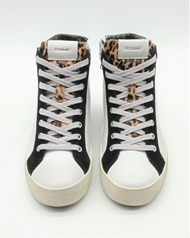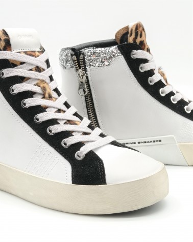 Crime London sneaker allacciata alta in pelle bianca con collarino glitter e dettagli in suede nero. Linguetta in cavallino animalier e logo in pelle bianco. Sul tallone patch in pelle fissato con micro viti, chiusura con lacci in cotone e zip laterale interna. Soletta interna estraibile.