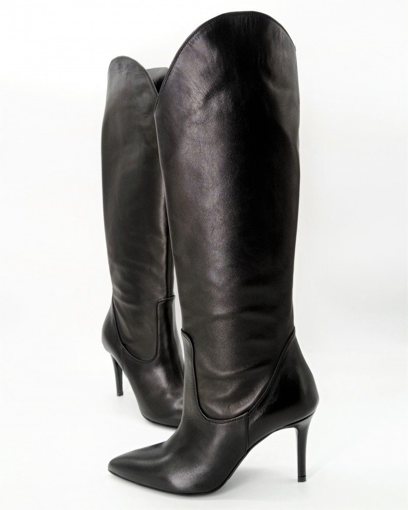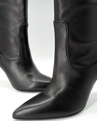 Stivale al ginocchio in pelle nera con linea a punta, tacco a spillo e taglio stondato. Tacco alto 8cm.