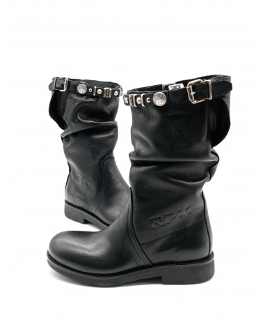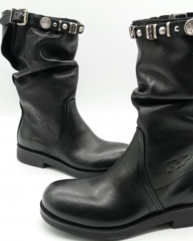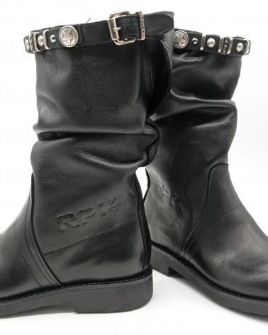 Biker in pelle nera di Rpk. Stivale pratico e comodo con tomaia, fodera e soletta totalmente in pelle, fondo gomma antiscivolo. Nella parte alta del gambale fascia con borchie removibili e fibbia regolabile.