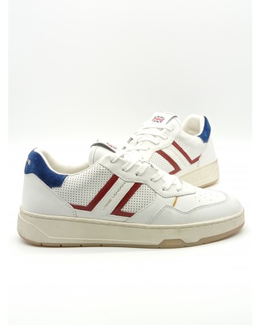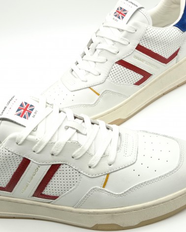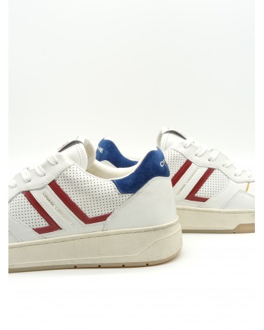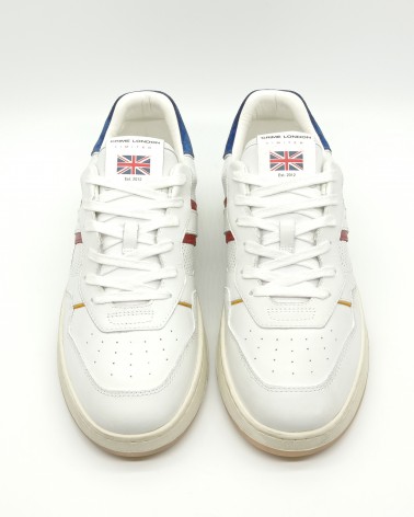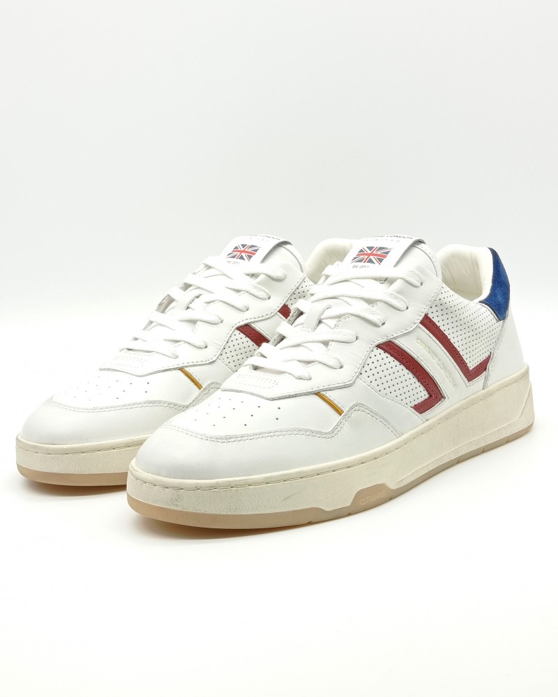 Modello Court di Crime London, tomaia in pelle bianca con particolare in camoscio blu sul tallone, pelle effetto forato laterale con rifiniture rosse e ocra. Allacciatura classica, plantare in pelle, estraibile.