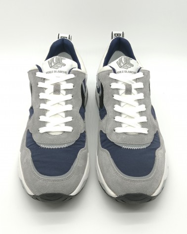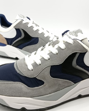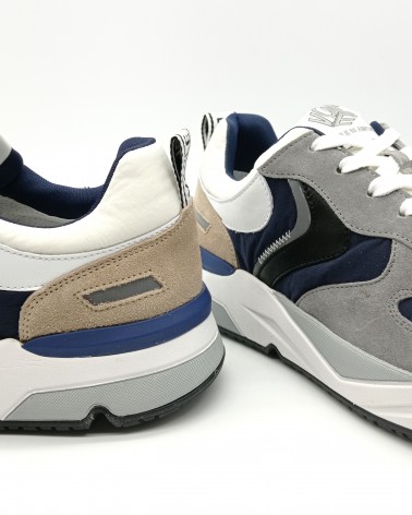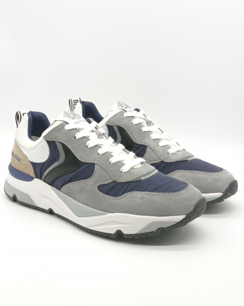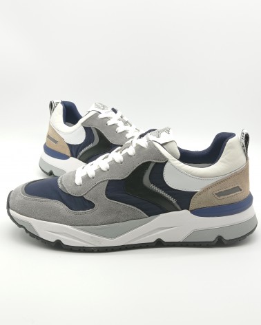 Sneaker allacciata di Voile Blanche, confort e gusto. Tomaia in camoscio e tessuto tecnico traspirantre con particolari in pelle in contrasto. Suola in gomma ultraleggera. Plantare in pelle ,estraibile.